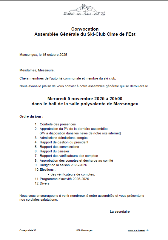 Assemblée Générale A tous les membres, nous vous invitons à participer à notre assemblée générale qui aura lieu dans le Hall de la salle polyvalente de Massongex le 5 novembre 2025 à 20h00.
