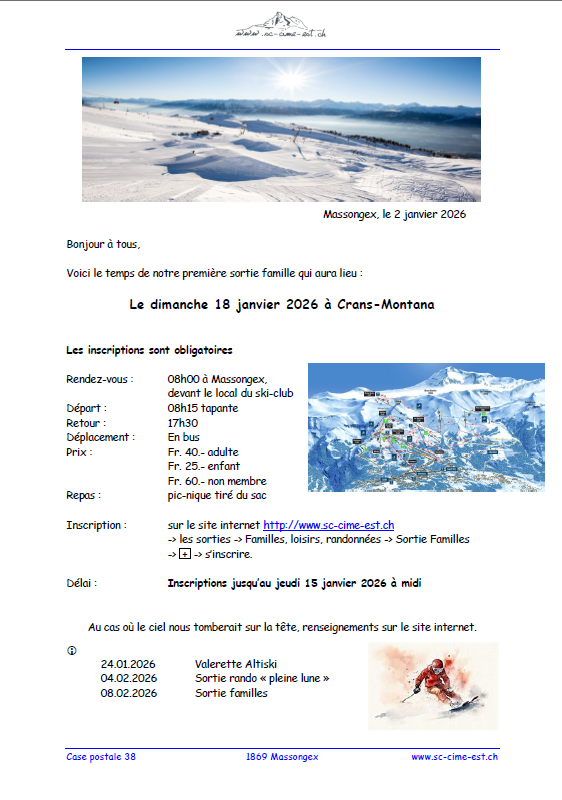Ce dimanche nous vous donnons rendez-vous pour la première sortie famille qui aura lieu à Crans-Montana. Les détails ci-dessous.