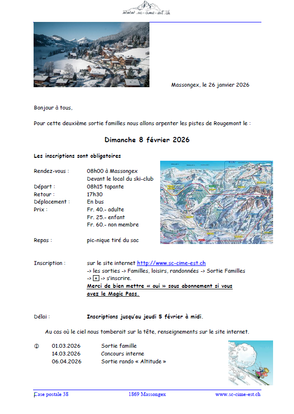 Sortie familles à Rougemont Le 8 février votre ski club vous propose une petite virée dans le pays d'en haut à Rougemont. De superbes pistes avec vue sur le Saanenland.